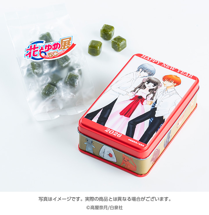 「花とゆめCOMICS」の表紙・裏表紙がデザインされたチョウバン缶に、カラフルなフルーツゼリーを詰め合わせました!