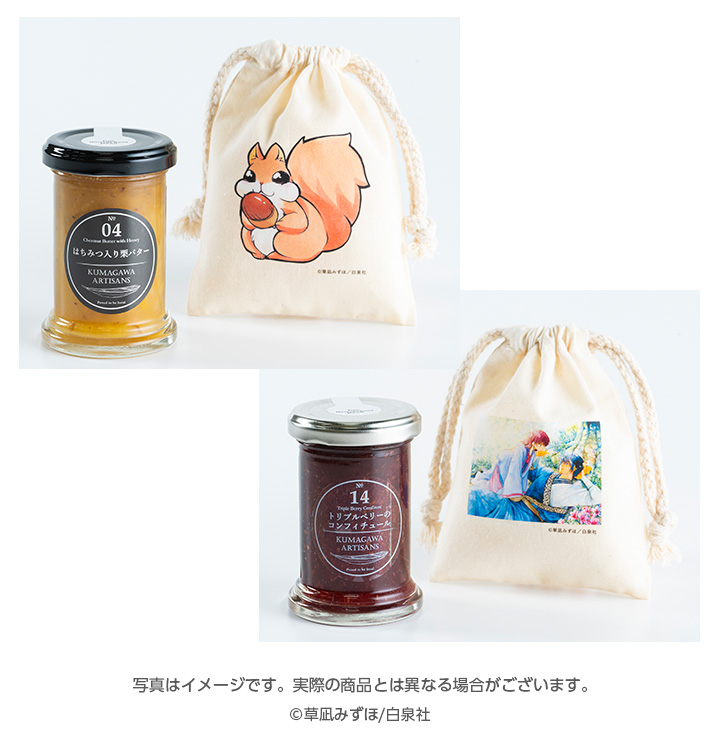 ヨナを連想させる“トリプルベリーのコンフィチュール”と、プッキューが好きそうな“はちみつ入り栗バター”。人吉球磨地方を中心に熊本県産品を使用したジャムです!